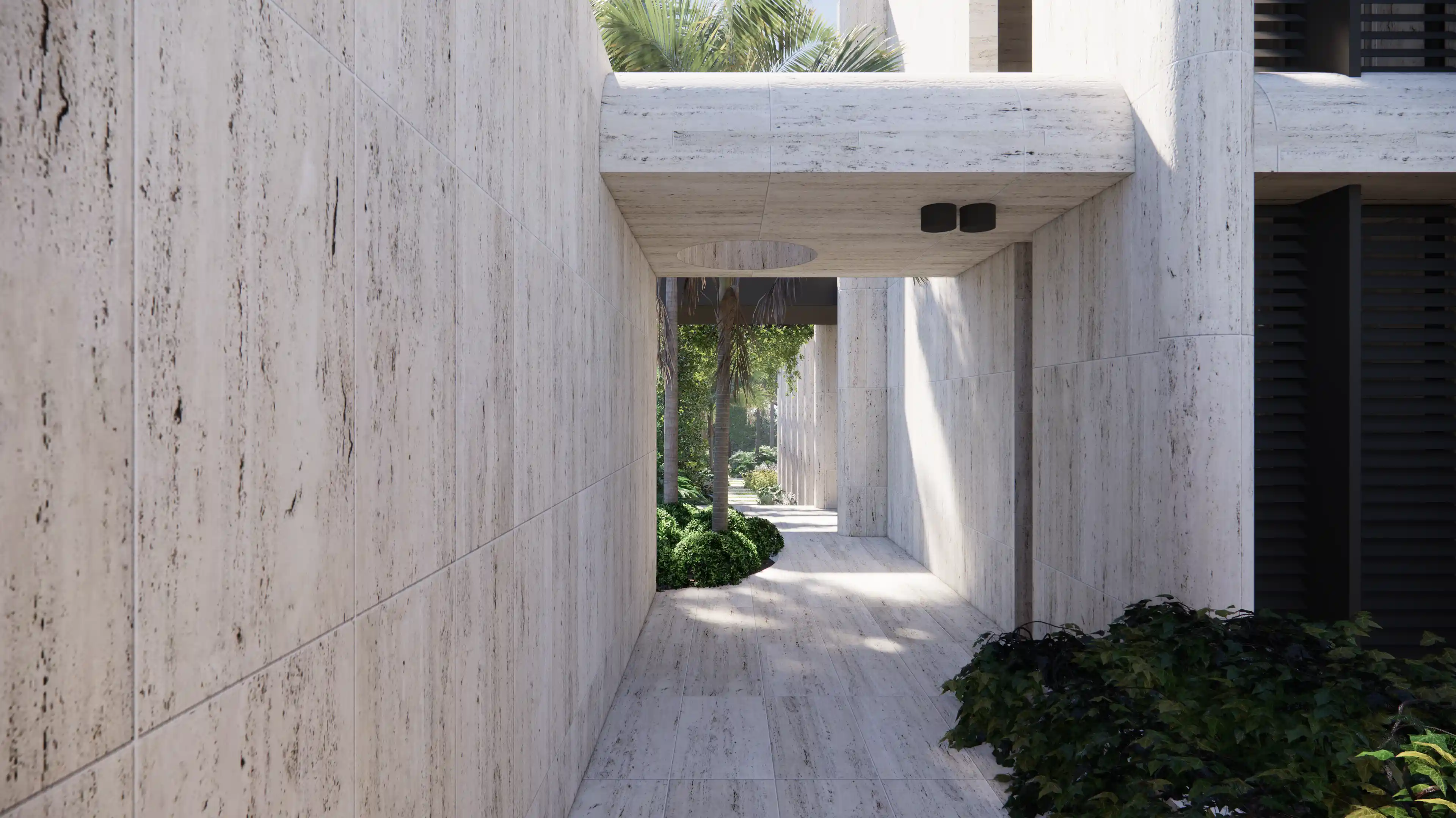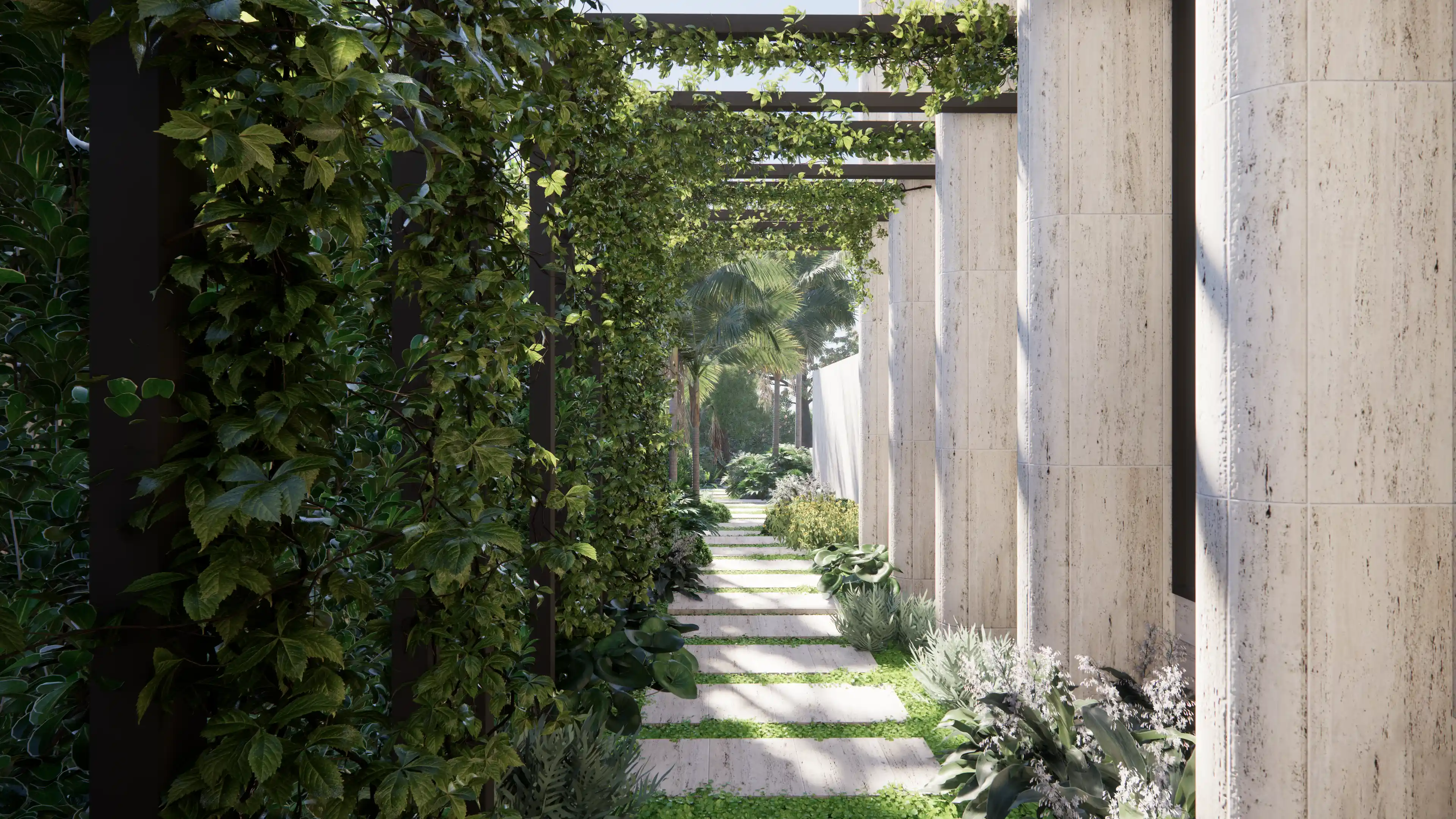 Movement through the site is guided by a planted arbour along the side of the dwelling, forming an elegant secondary path that links the front garden to the rear. This transitional space heightens the experience of moving through the landscape, gradually revealing the entertaining areas beyond.