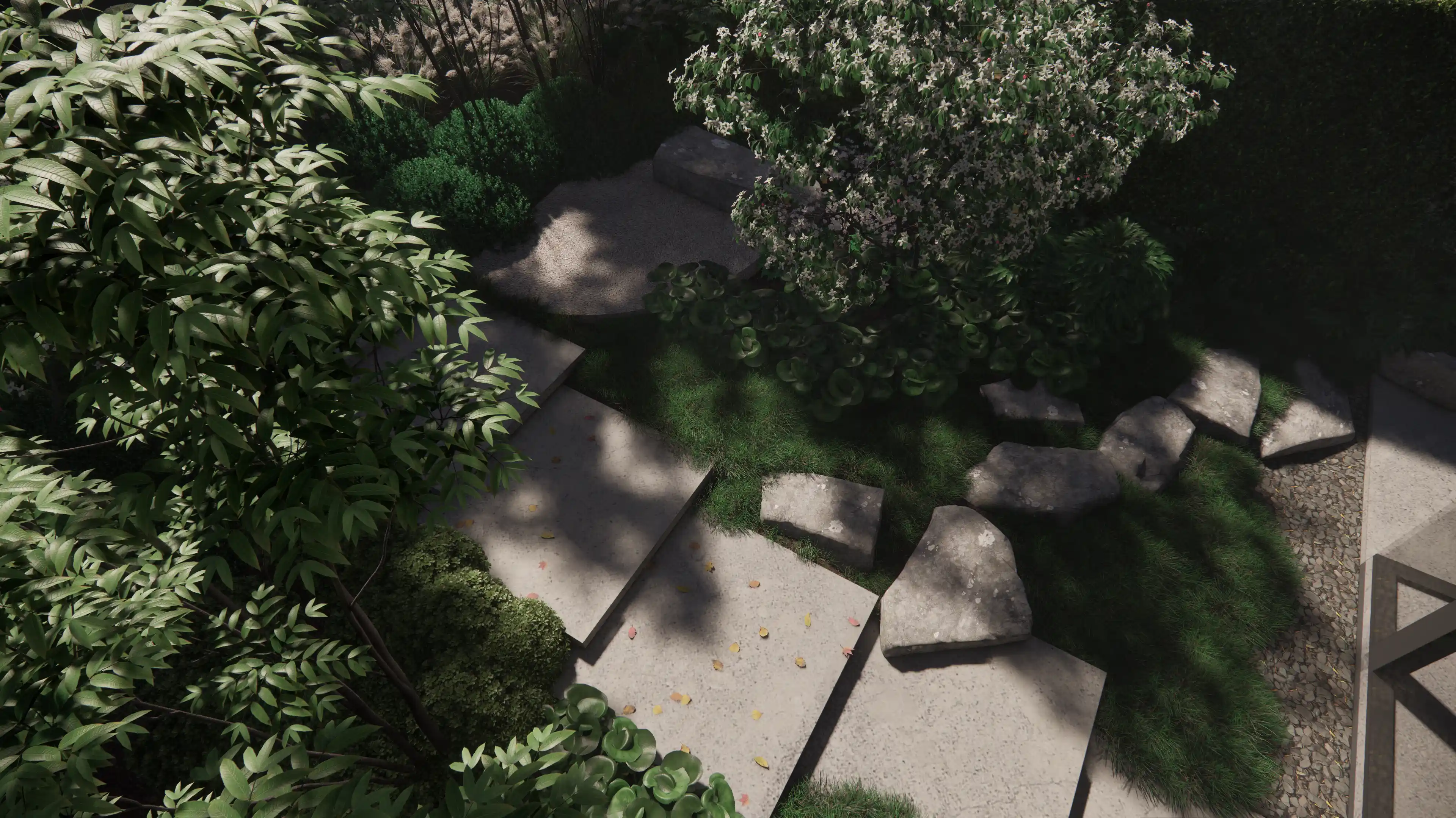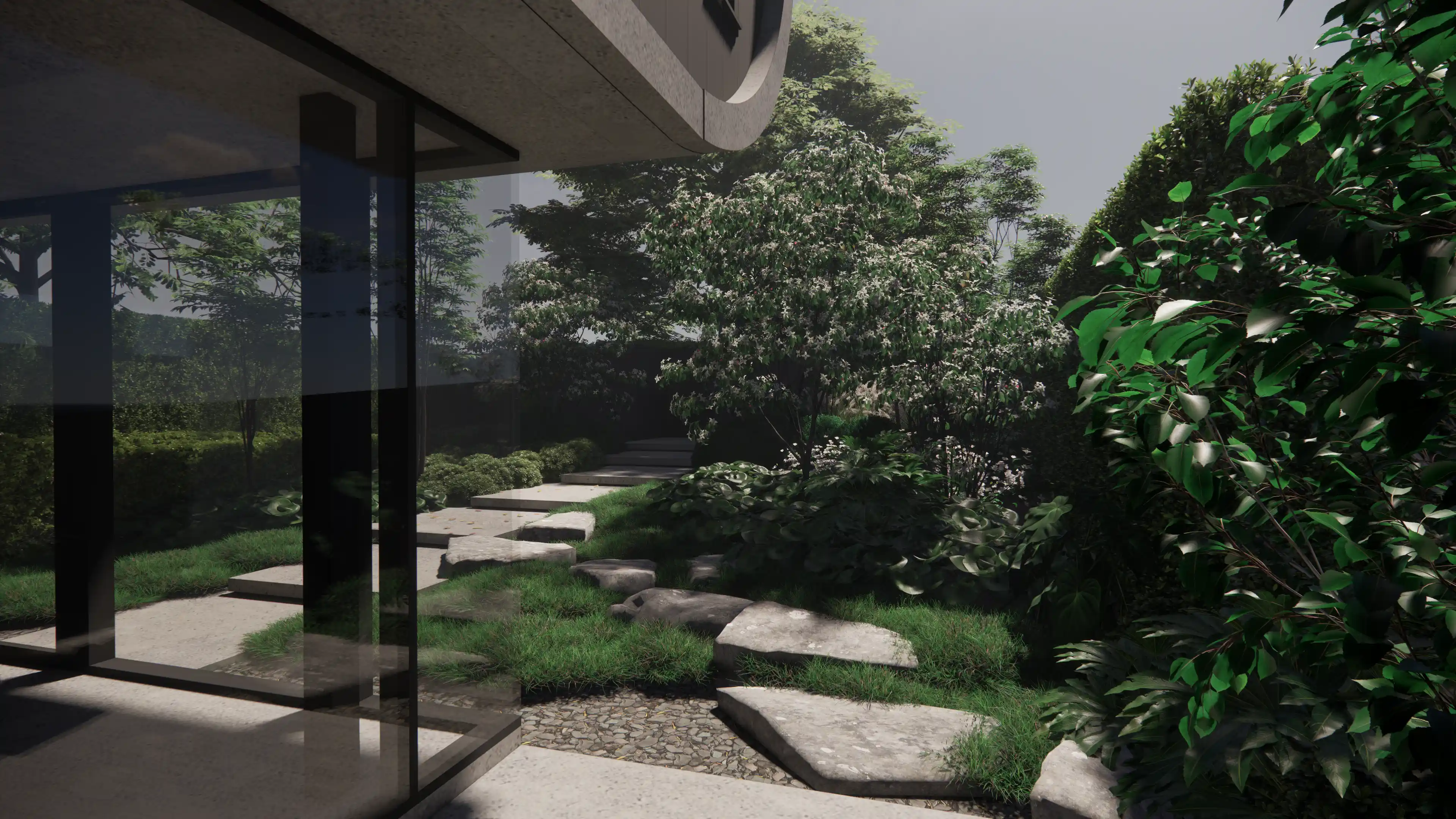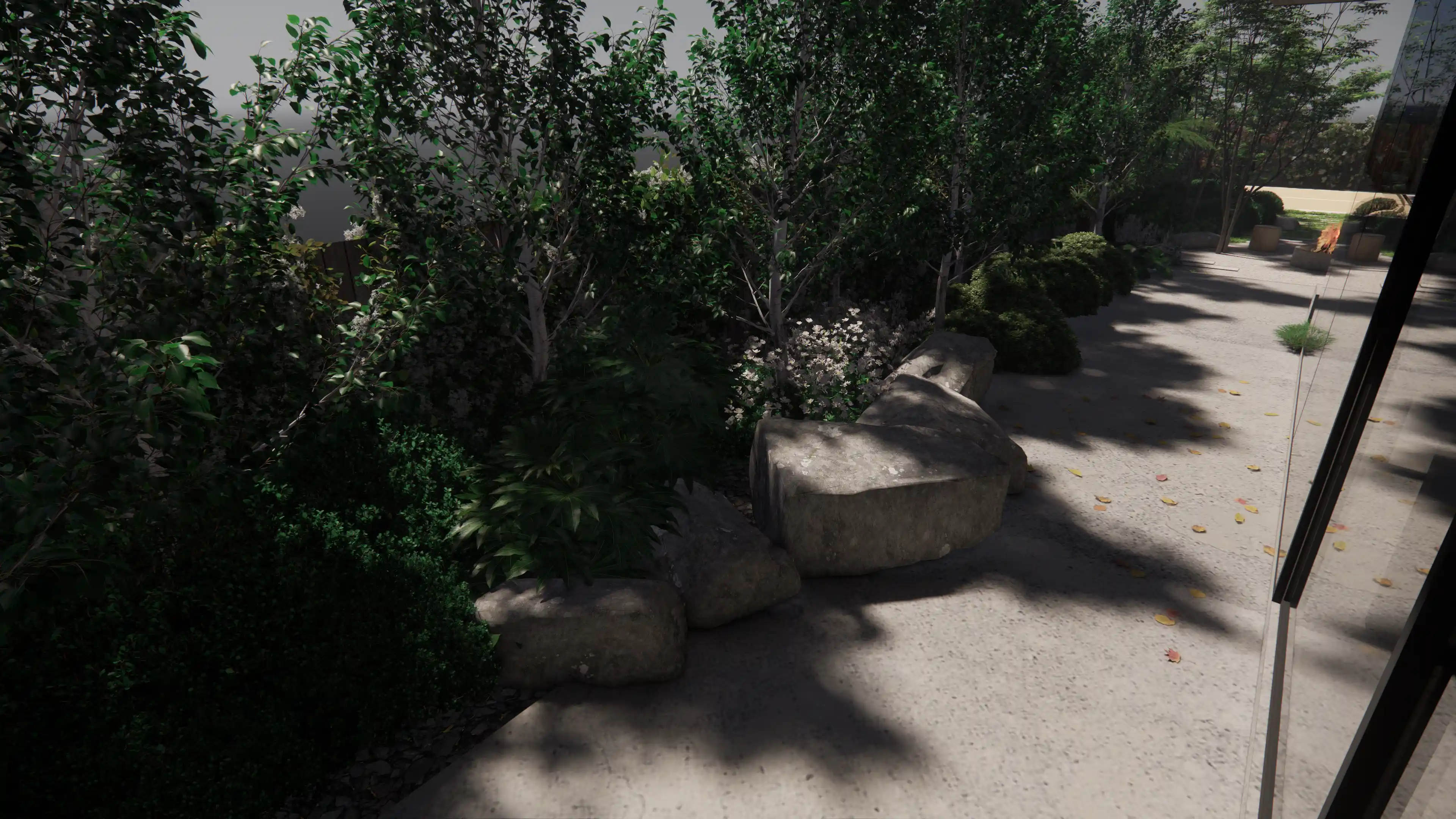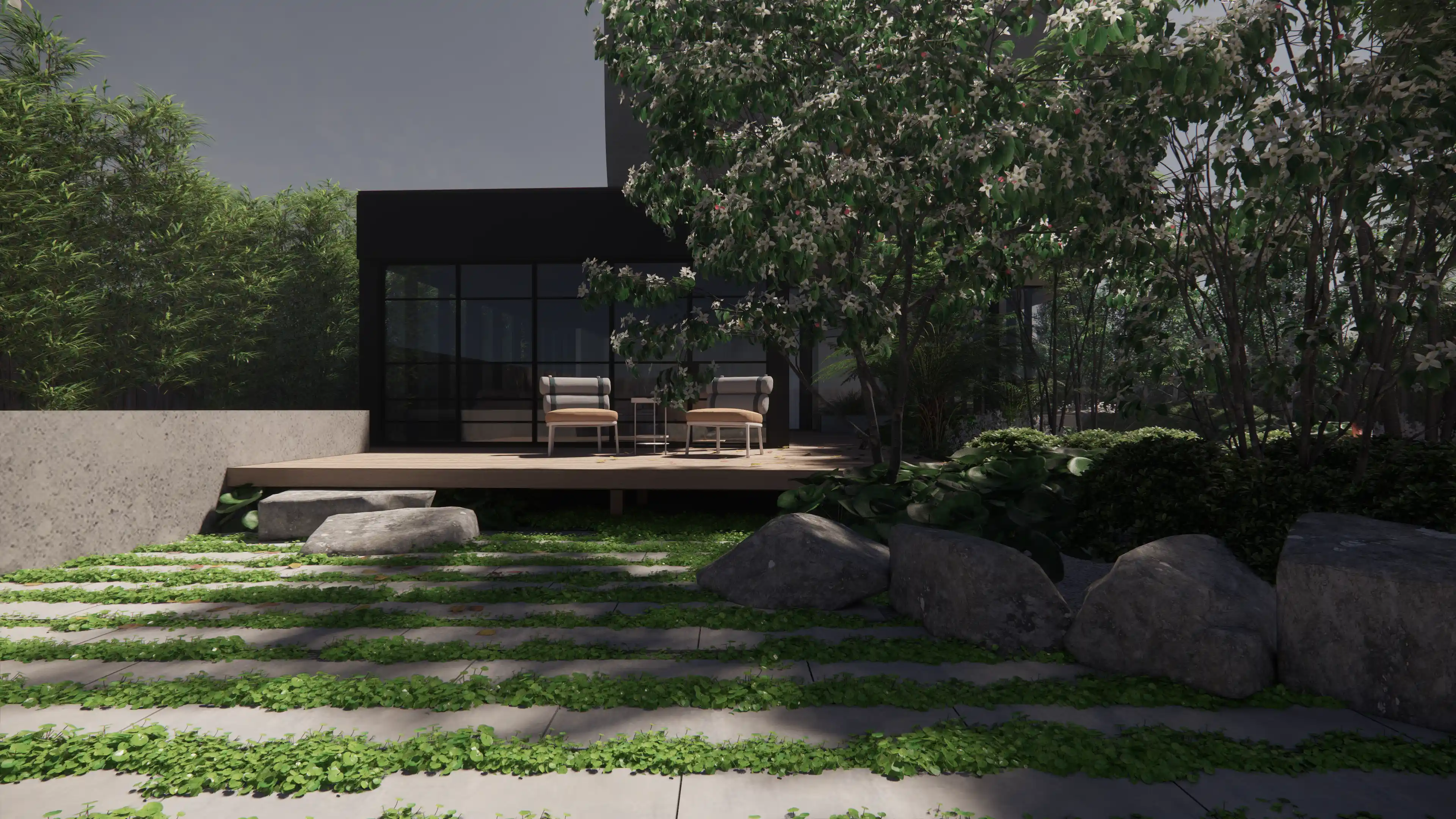 Drawing on Japanese and Chinese garden principles, the landscape is guided by ideas of procession, pause, and balance. A floating concrete entry path sets the tone on arrival, its stepped form creating a measured transition from street to garden. Repetition of natural stone boulders throughout the site reinforces a sense of rhythm, with these elements functioning both as steppers and informal seating, encouraging movement and interaction within the space.