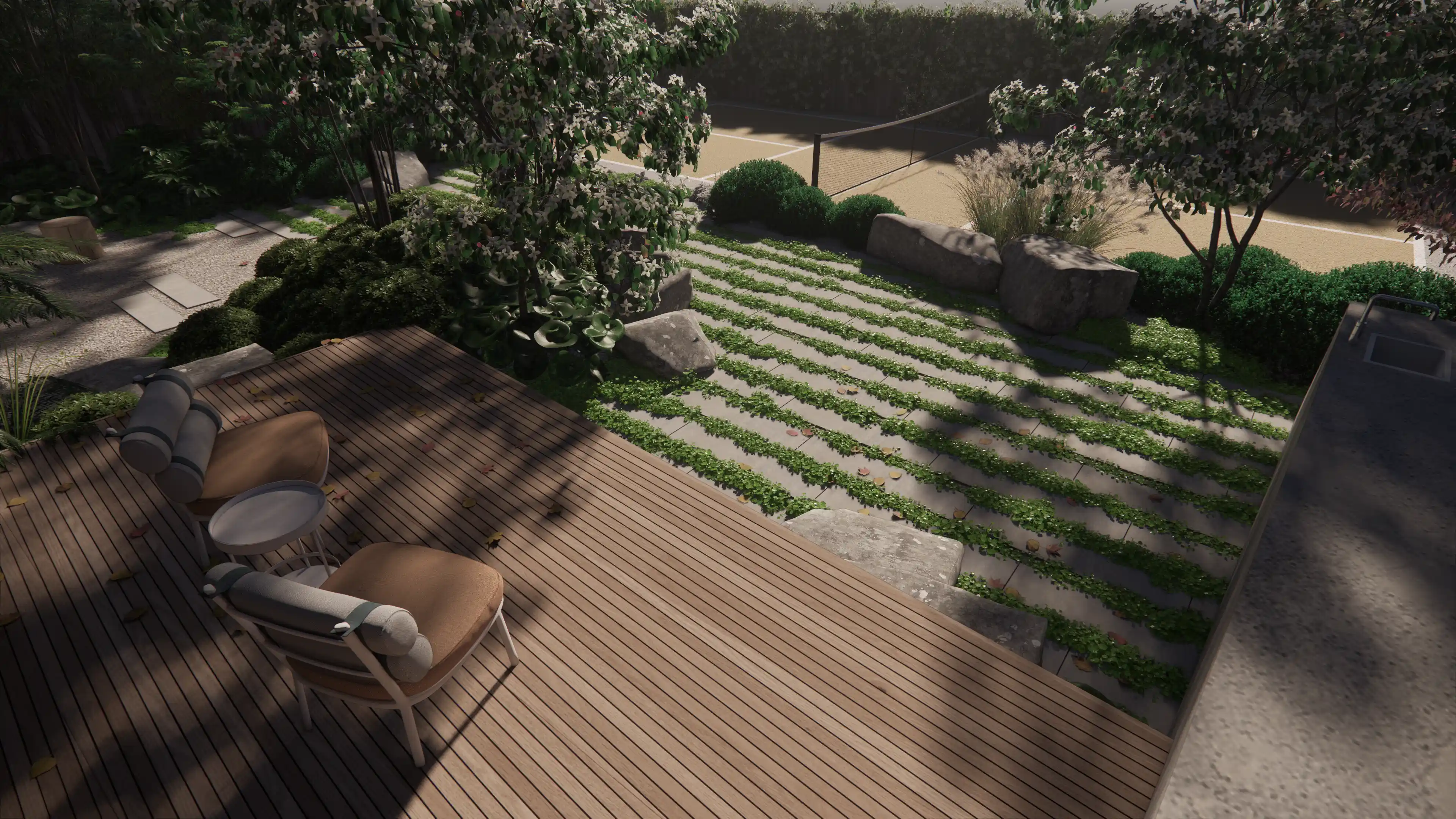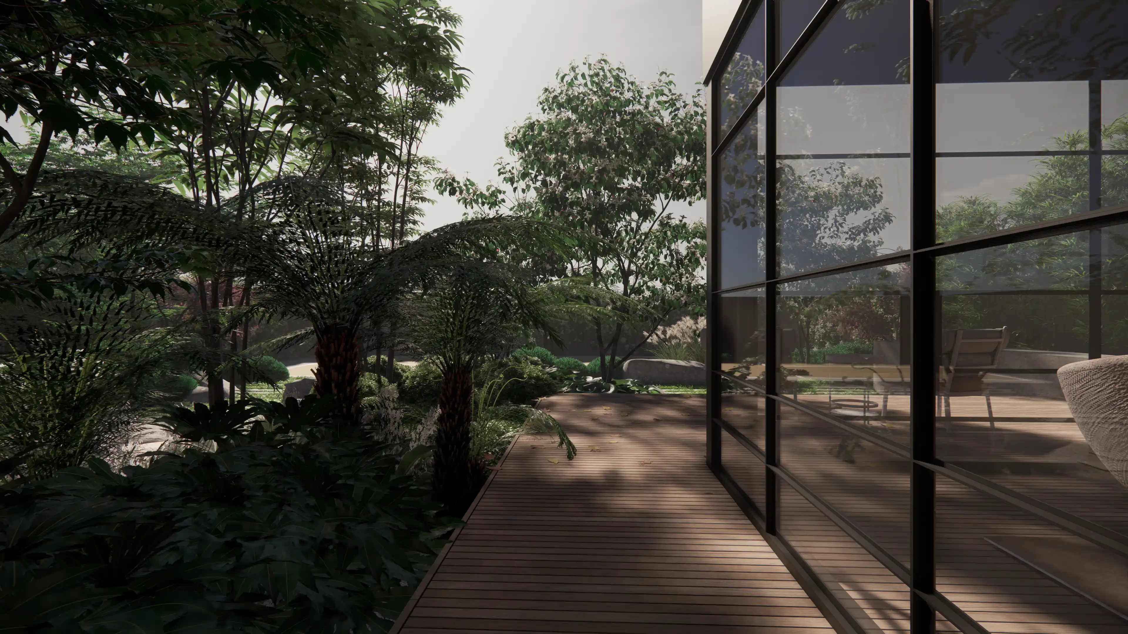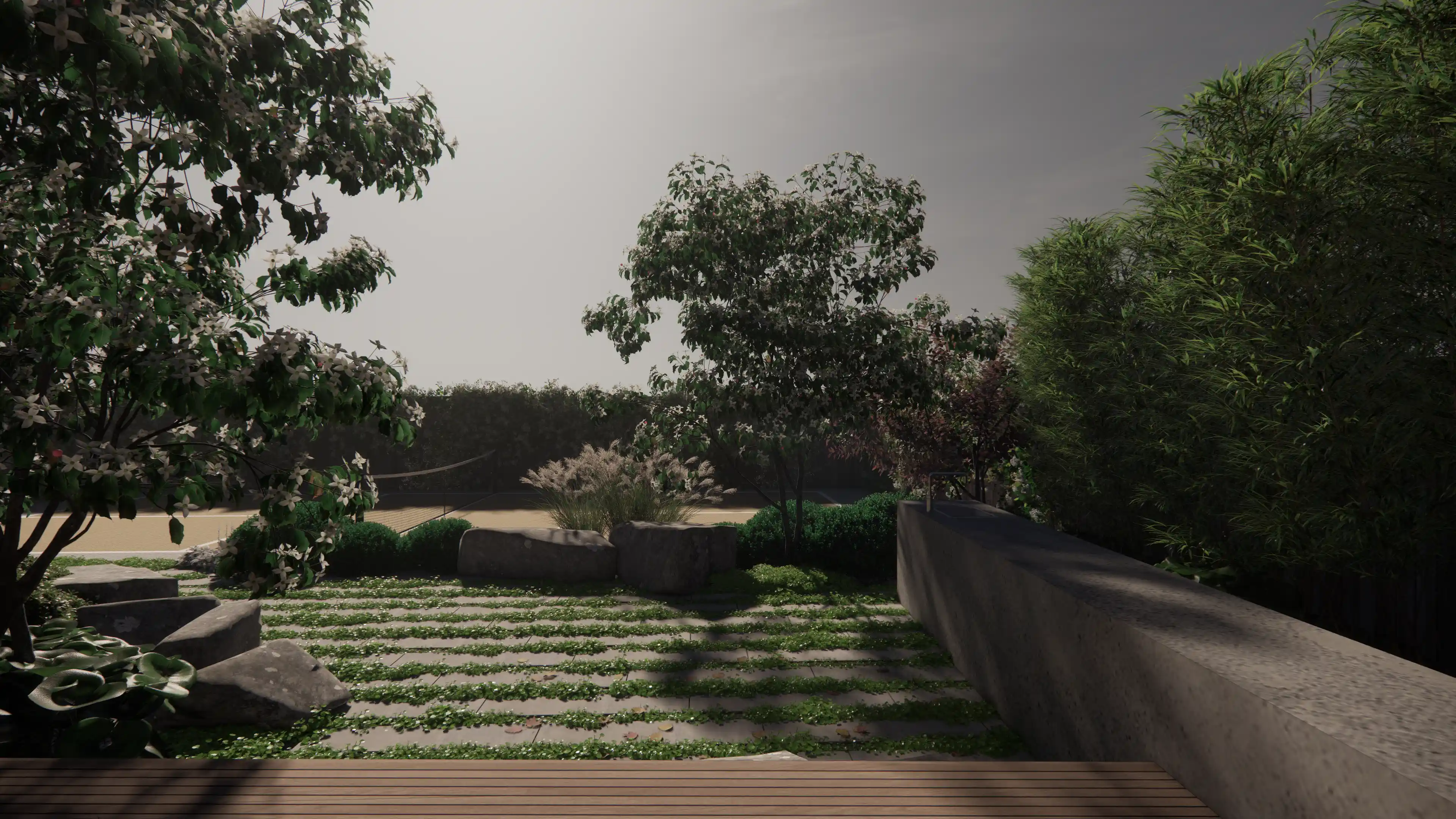 Toward the rear, the garden opens to a floating deck that wraps around a proposed zen room, forming a calm focal point within the landscape. A concrete bench servery integrates seamlessly into this setting, supporting entertaining while maintaining a strong architectural presence. Planting is intentionally restrained, allowing materiality, form, and negative space to carry the experience.