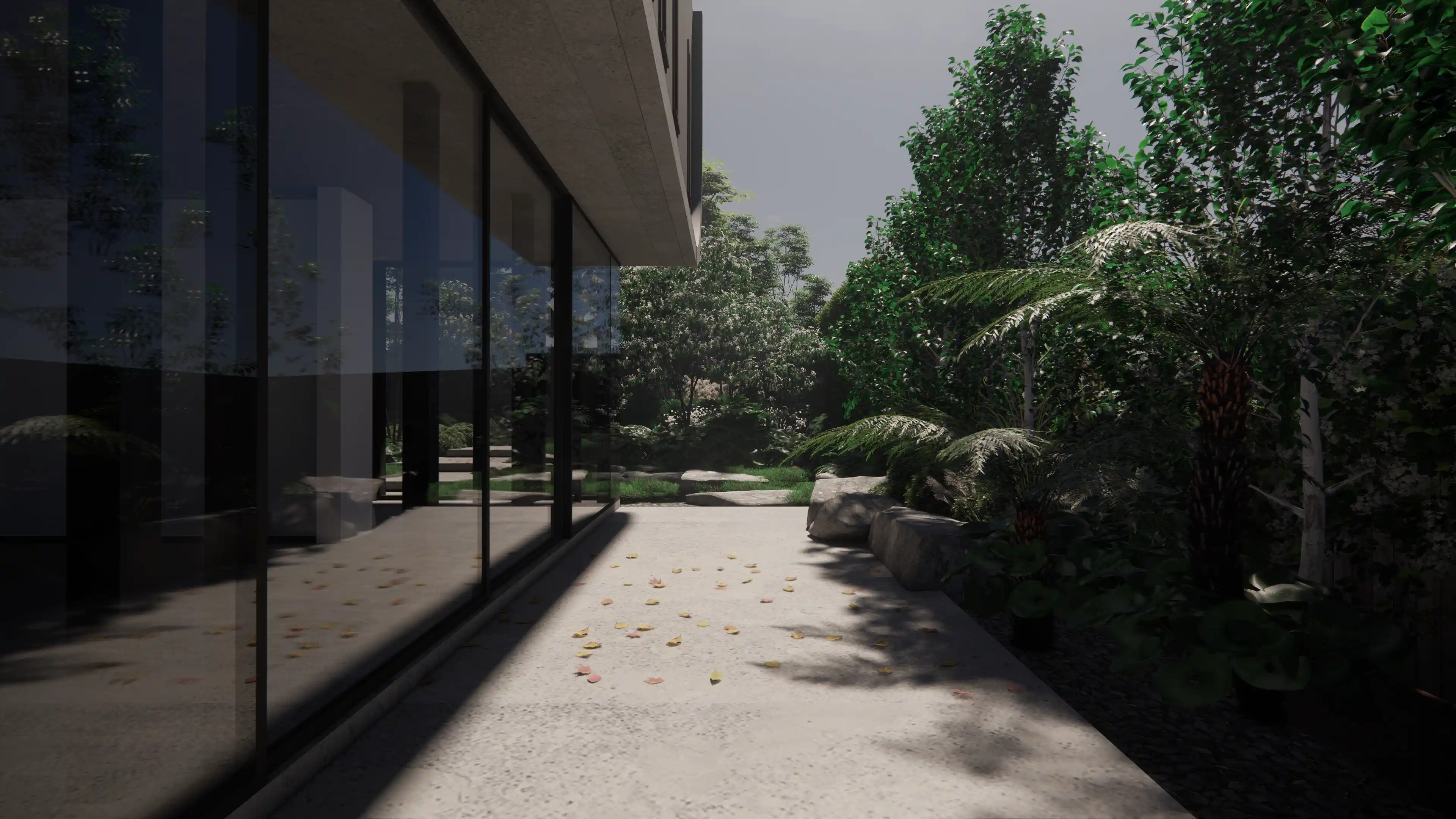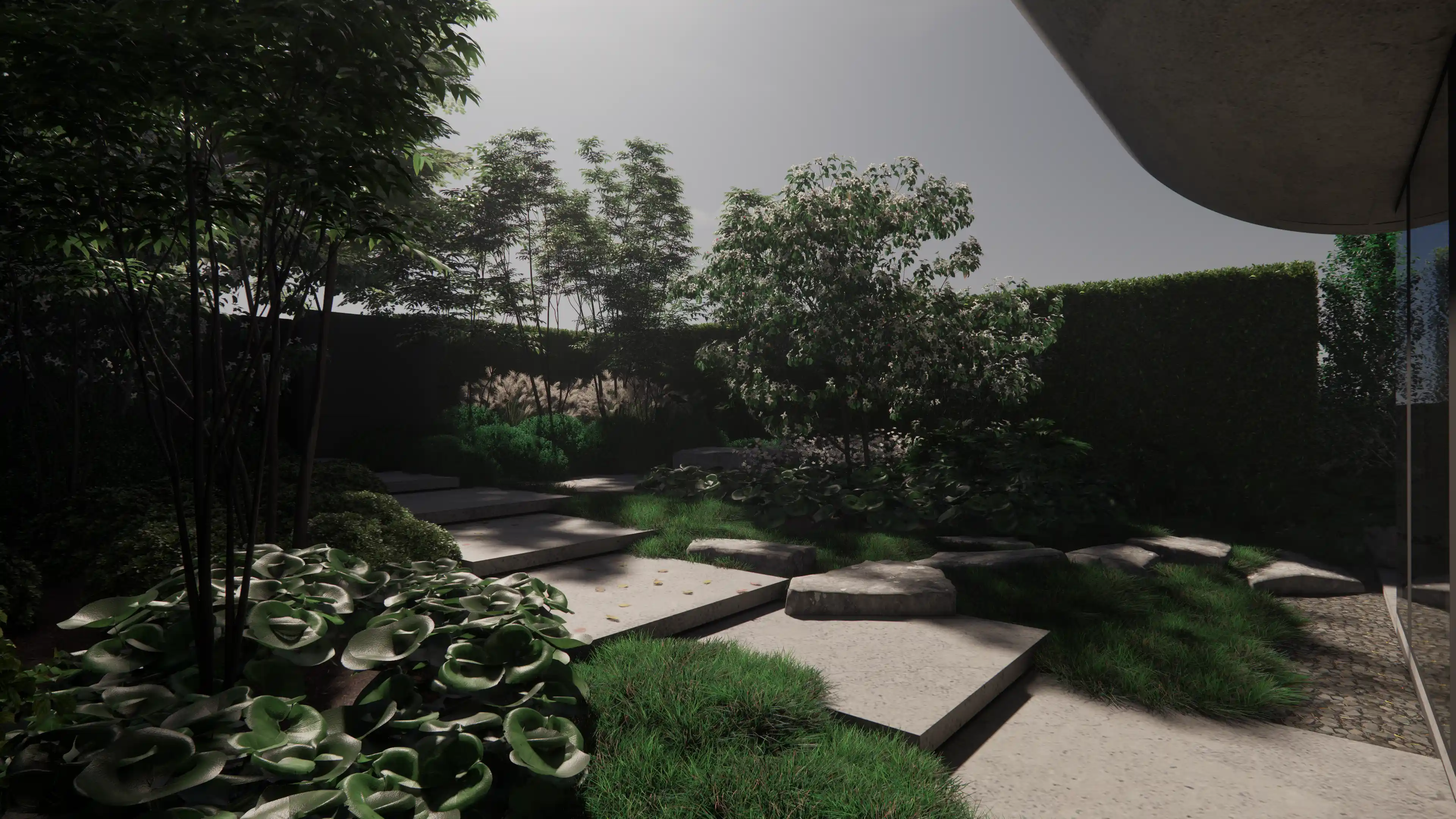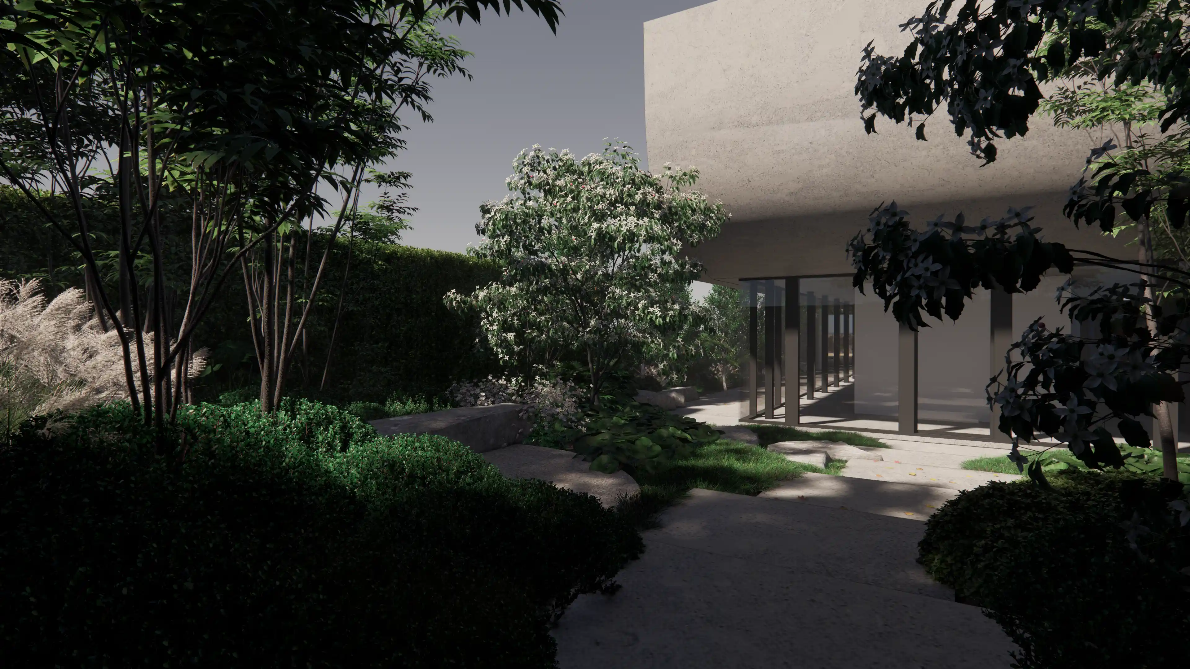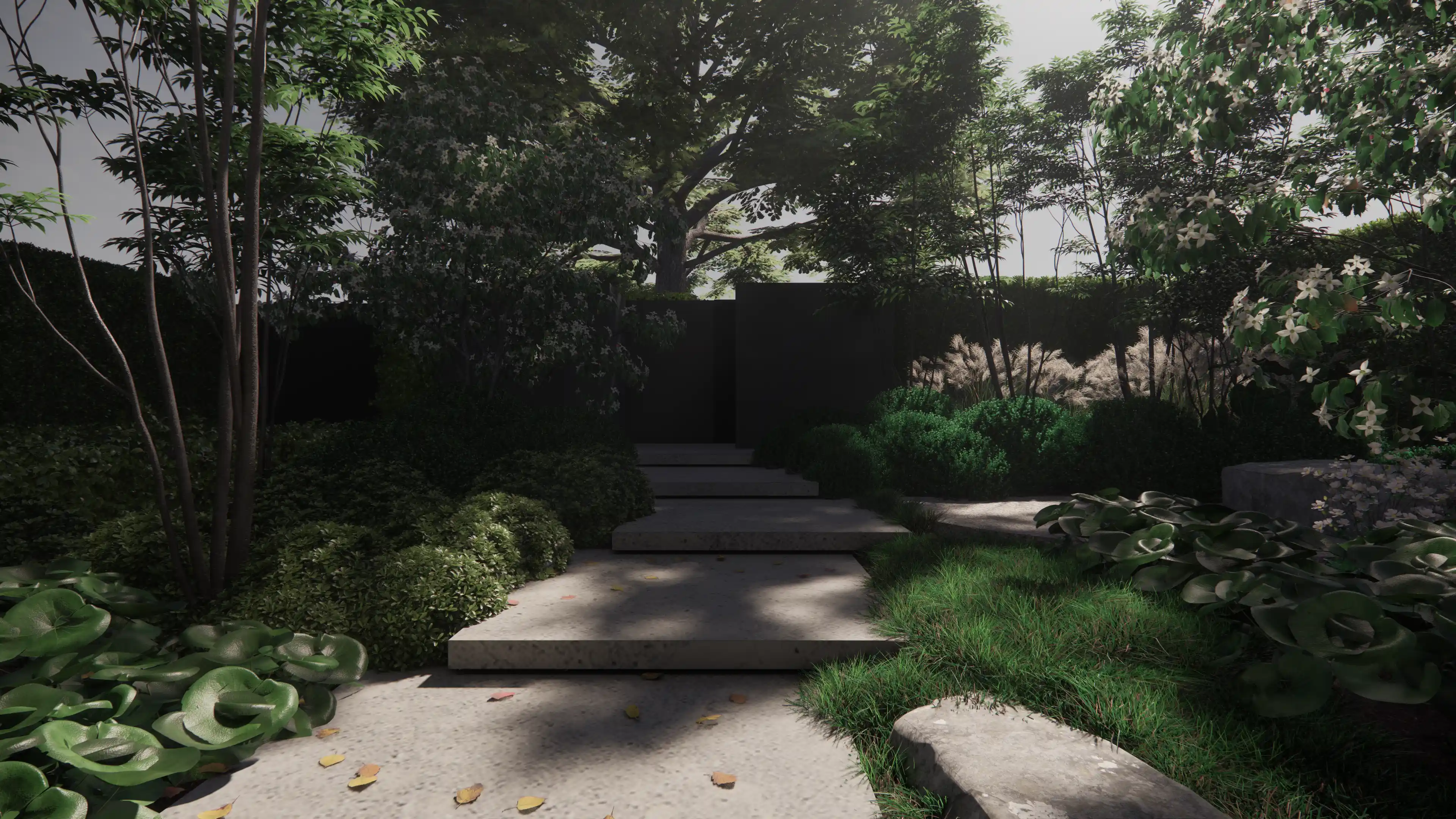 Toward the rear, the garden opens to a floating deck that wraps around a proposed zen room, forming a calm focal point within the landscape. A concrete bench servery integrates seamlessly into this setting, supporting entertaining while maintaining a strong architectural presence. Planting is intentionally restrained, allowing materiality, form, and negative space to carry the experience.