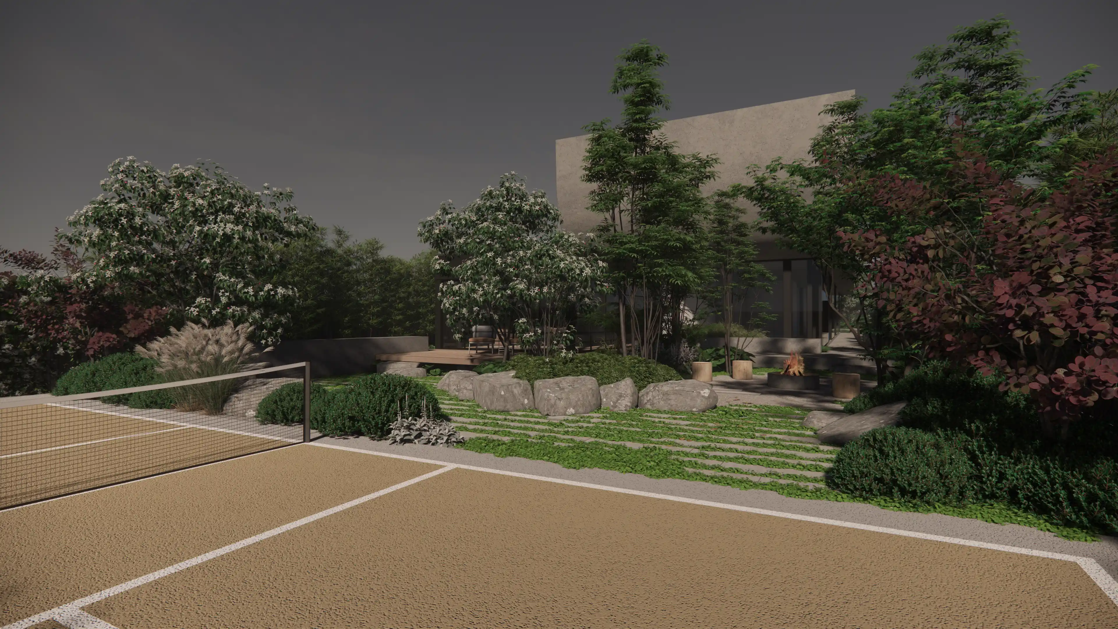 To ensure the garden remains active and adaptable, a pickleball court is incorporated at the rear of the site. Carefully integrated into the overall layout, it adds a layer of energy and play without compromising the garden’s sense of calm. The result is a landscape that balances structure and softness that supports social connection, movement, and quiet retreat within a cohesive, contemporary framework.