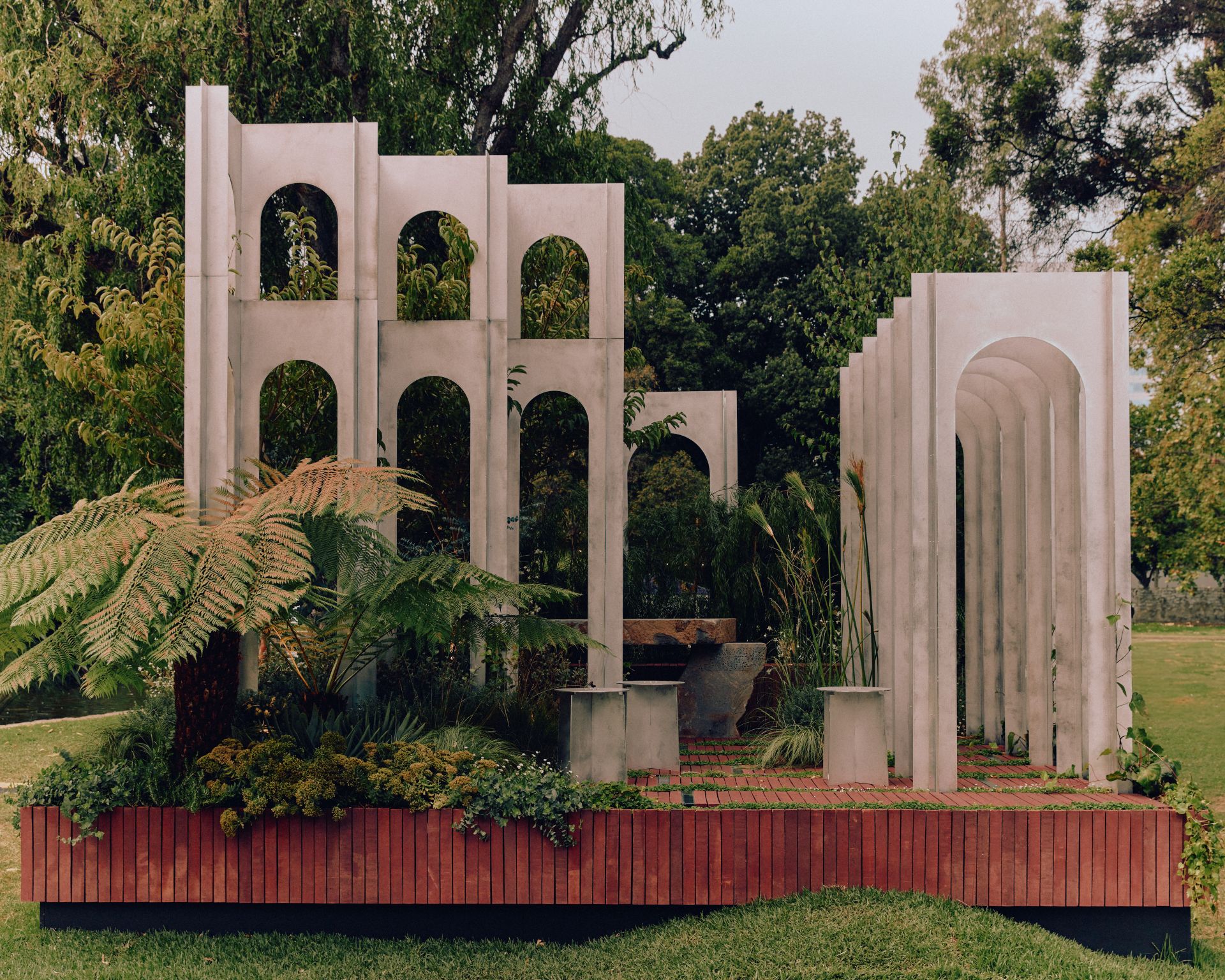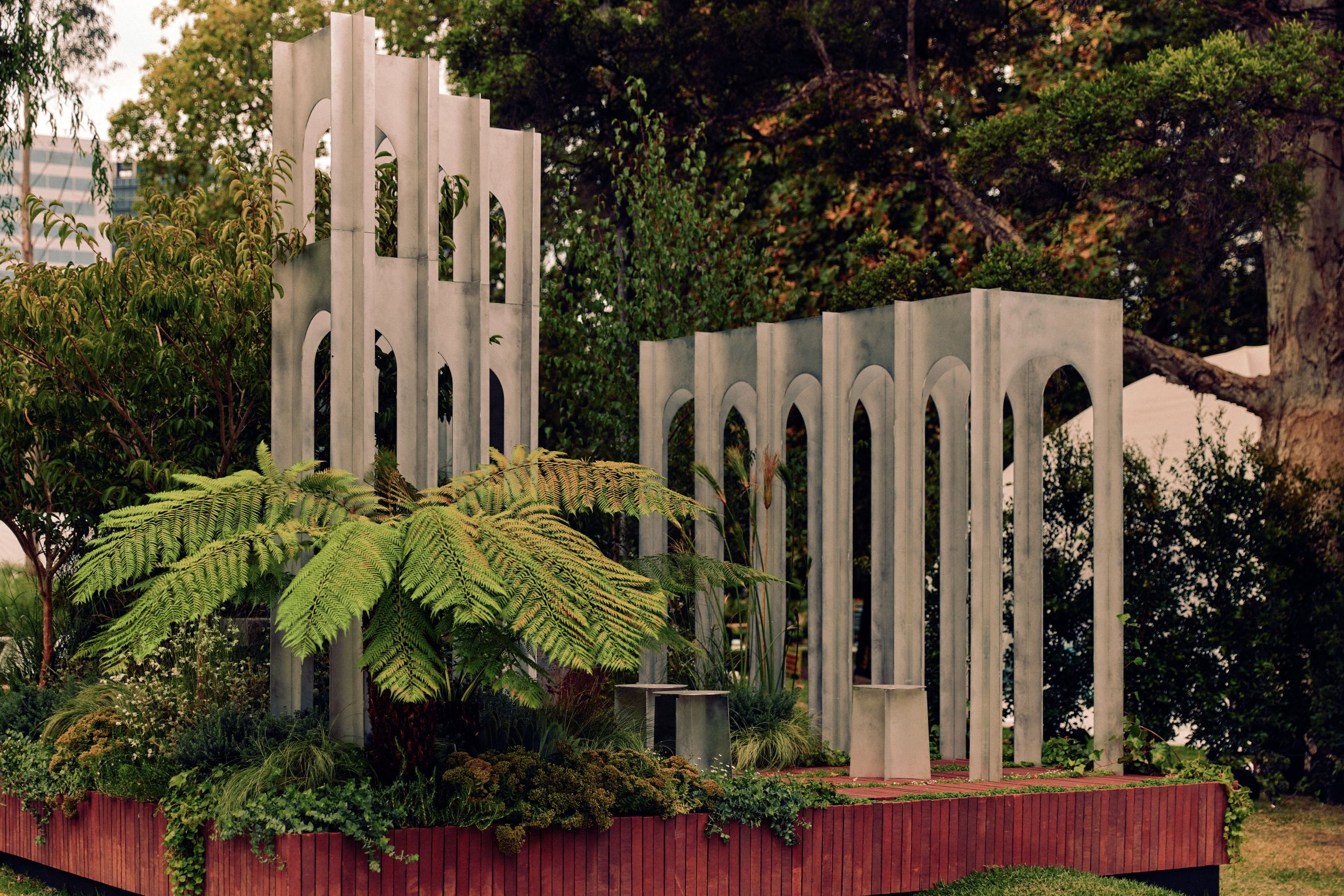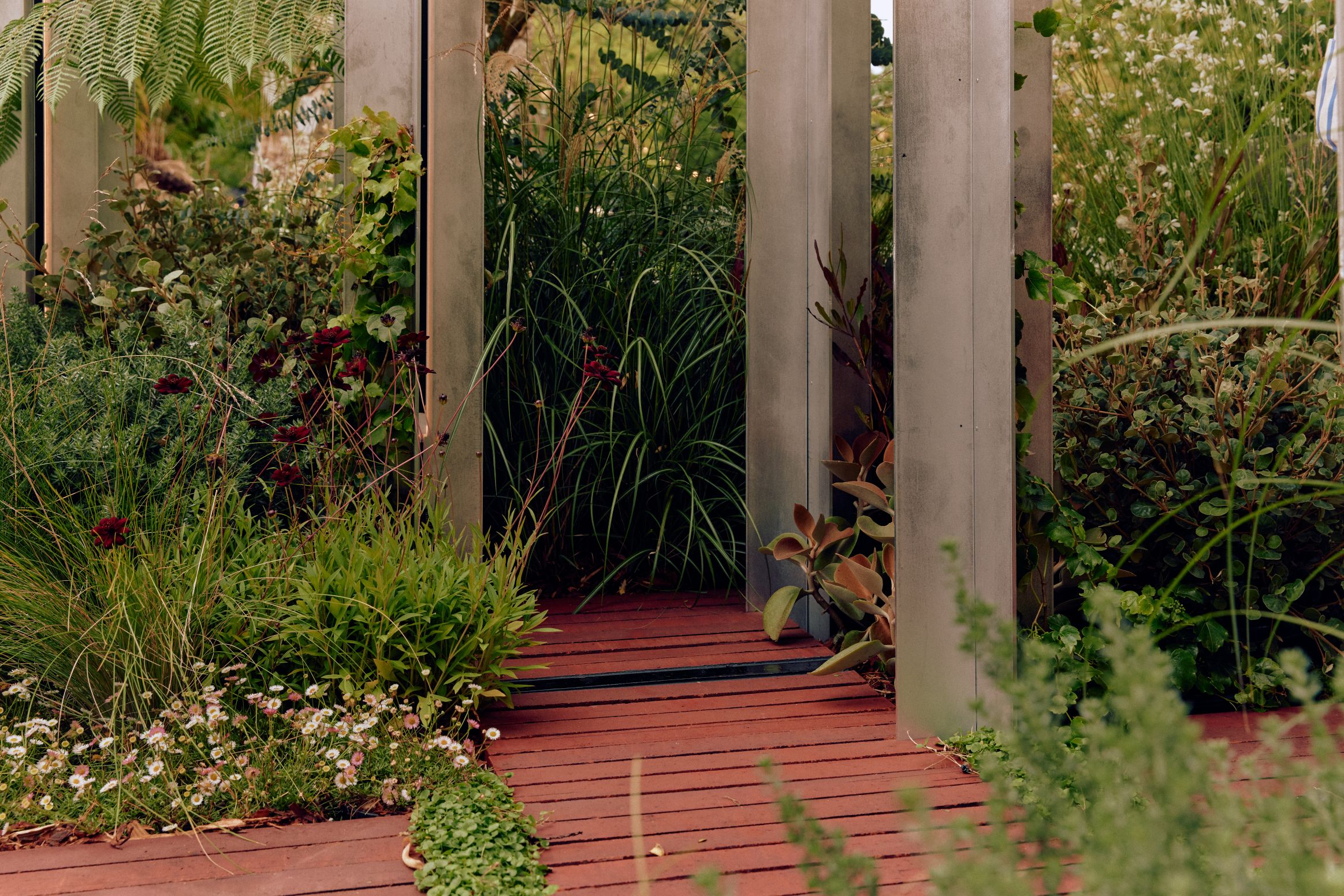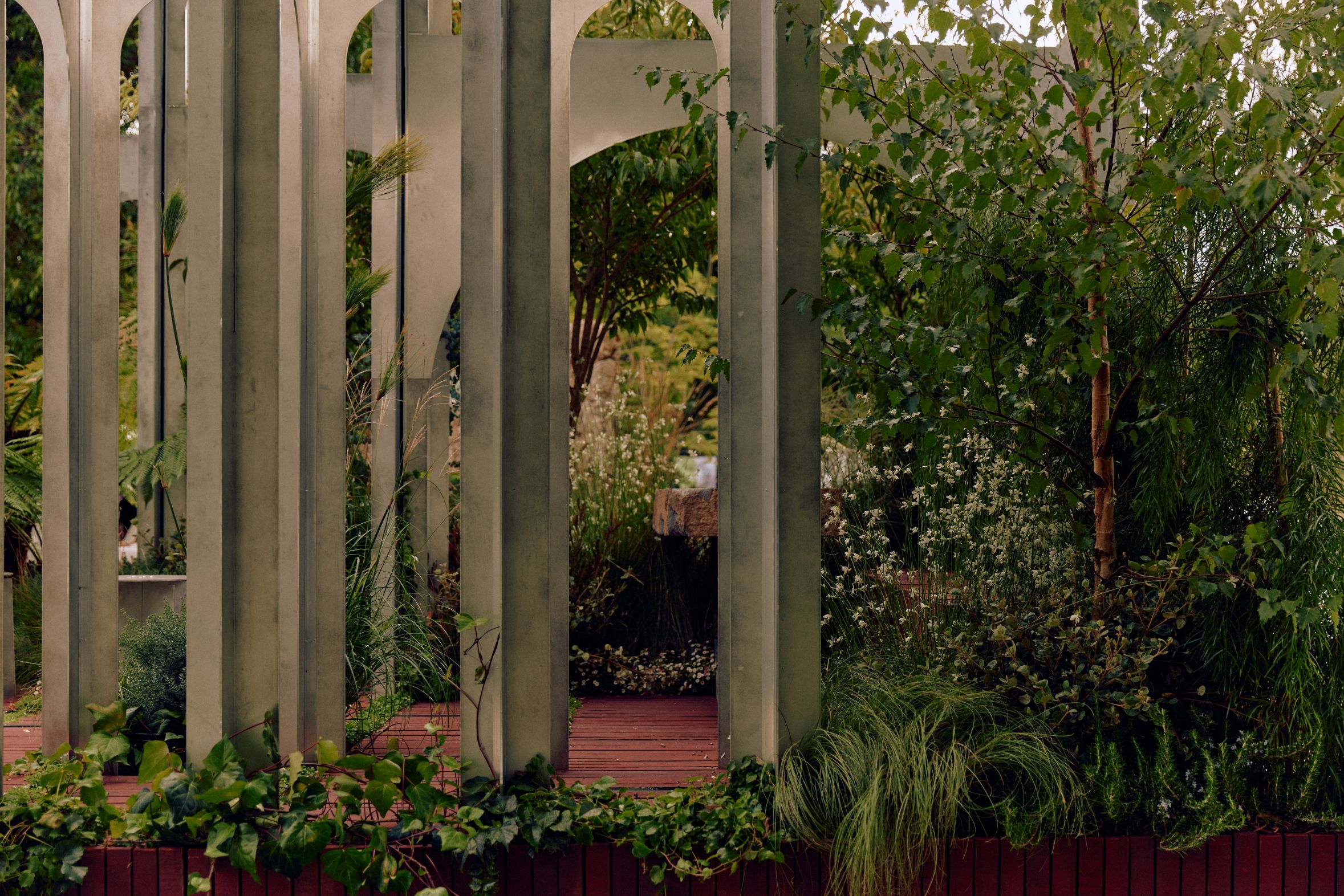 As a show garden, it offered us the rare freedom to push our creative boundaries and explore planting in ways a typical residential commission might not allow. This became a laboratory for form, texture, and seasonal layering, an opportunity to experiment with bold combinations, sculptural plantings, and immersive greenery that guide the eye and invite lingering. Planting was not merely decorative; it became a tool for storytelling, shaping spaces that are visually striking, experientially rich, and intimately connected to the surrounding environment.